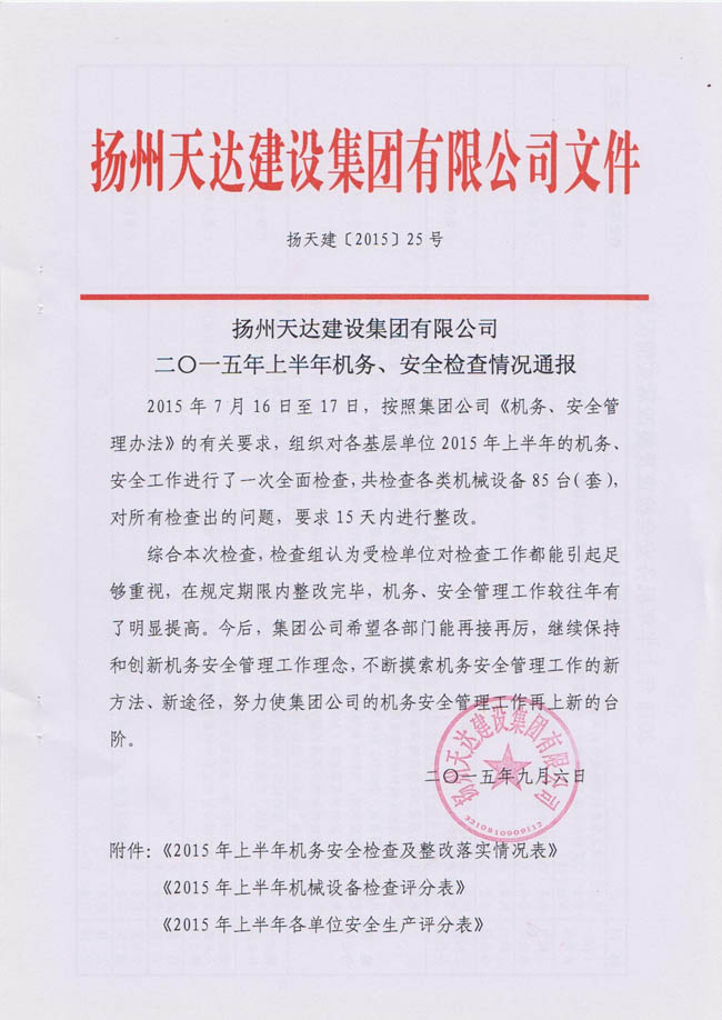 揚州天達建設(shè)集團有限公司二O一五年上半年機務(wù)、安全檢查情況通報