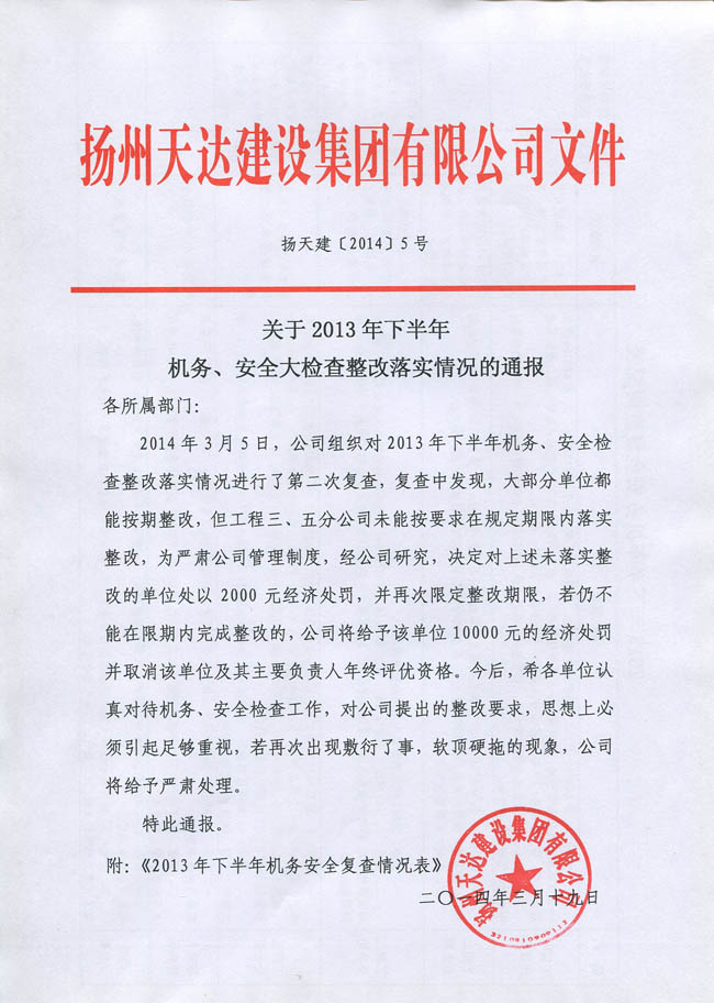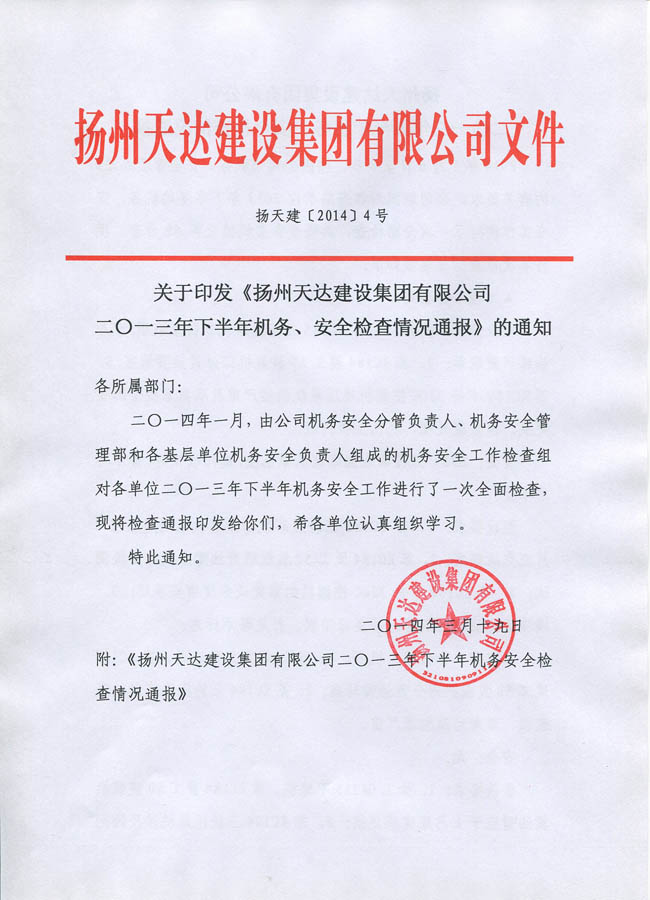 關(guān)于印發(fā)《揚(yáng)州天達(dá)建設(shè)集團(tuán)有限公司2013年下半年機(jī)務(wù)安全檢查情況通報(bào)》的通知