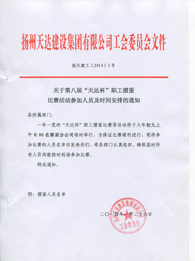 關(guān)于第八屆“天達(dá)杯”職工摜蛋比賽活動(dòng)參加人員及時(shí)間安排的通知