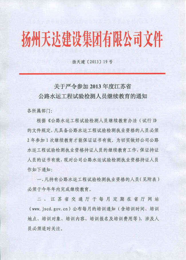 關(guān)于嚴(yán)令參加2013年度江蘇省公路試驗(yàn)檢測(cè)人員繼續(xù)教育的通知