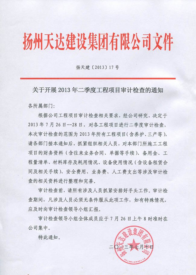 關(guān)于開展2013年二季度工程項(xiàng)目審計(jì)檢查的通知