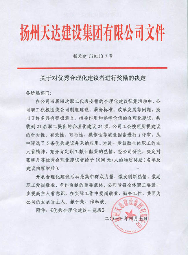 關(guān)于對優(yōu)秀合理化建議者進(jìn)行獎勵的決定