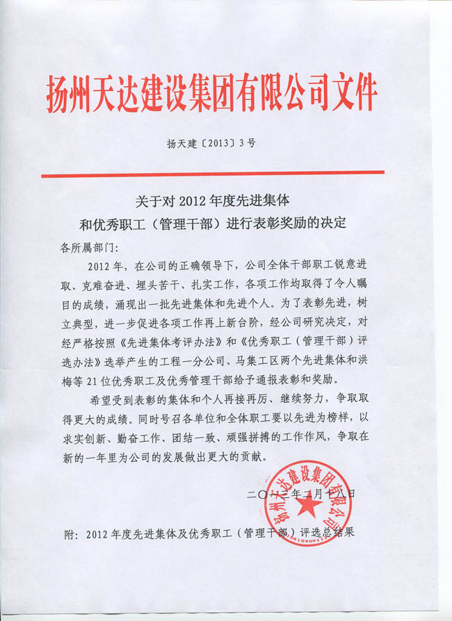 關(guān)于對2012年度先進集體和優(yōu)秀職工(管理干部)進行表彰獎勵的決定