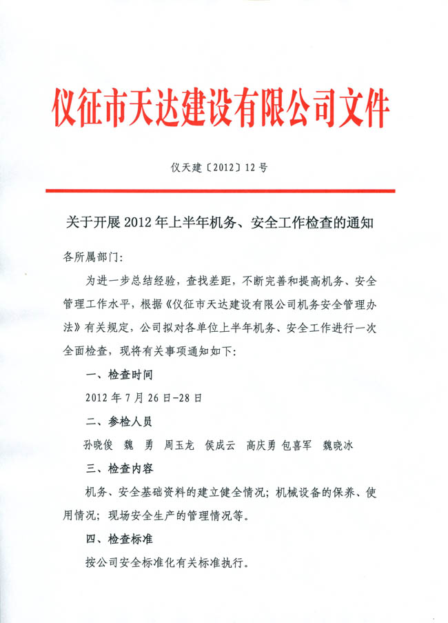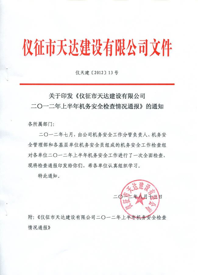 關(guān)于印發(fā)《儀征市天達(dá)建設(shè)有限公司2012年上半年機(jī)務(wù)安全檢查情況通報(bào)》的通知