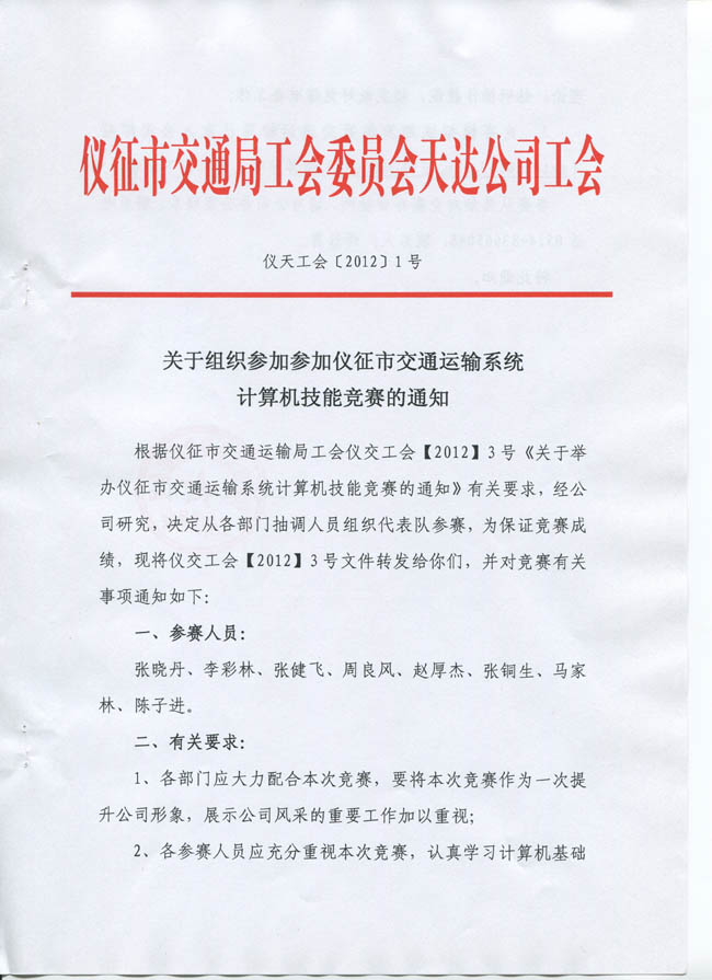 關(guān)于組織參加儀征市交通運(yùn)輸系統(tǒng)計(jì)算機(jī)技能競賽的通知