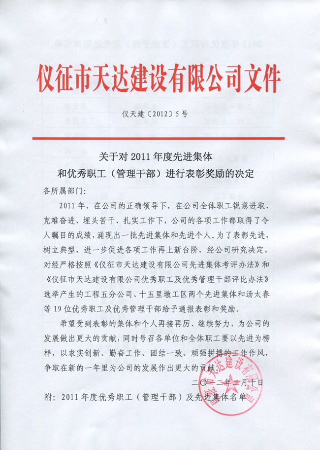 關于對2011年度先進集體和優(yōu)秀職工(管理干部)進行表彰獎勵的決定