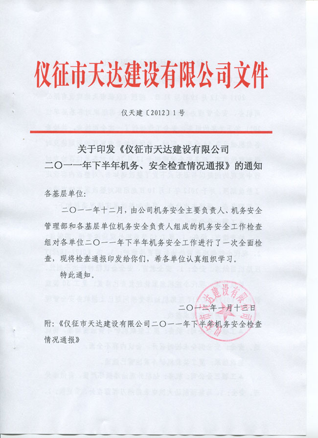 關(guān)于印發(fā)《儀征市天達(dá)建設(shè)有限公司2011年下半年機(jī)務(wù)安全檢查情況通報(bào)》的通知