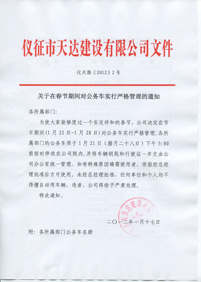 關(guān)于在春節(jié)期間對(duì)公務(wù)車實(shí)行嚴(yán)格管理的通知