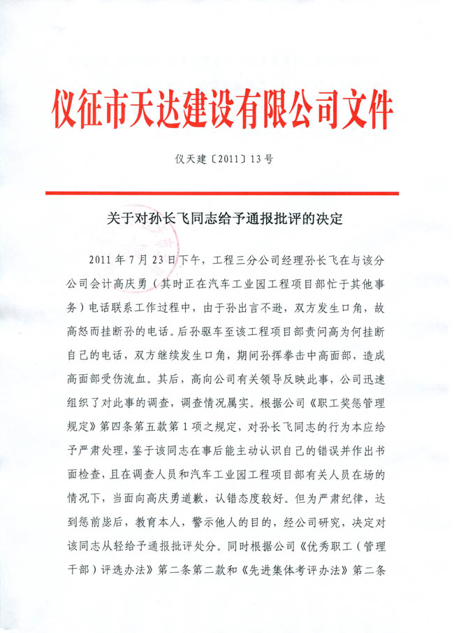 關(guān)于對(duì)孫長(zhǎng)飛同志給予通報(bào)批評(píng)的決定
