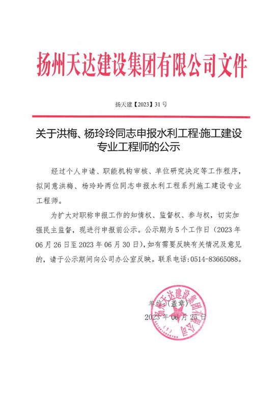 關(guān)于洪梅、楊玲玲同志申報(bào)水利工程施工建設(shè)專業(yè)工程師的公示