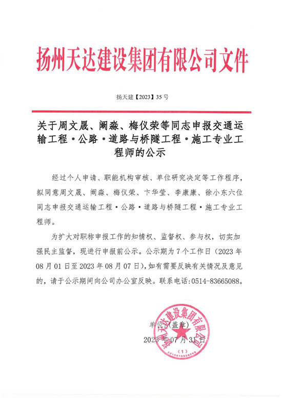 關(guān)于周文晟、闞淼、梅儀榮等同志申報(bào)交通運(yùn)輸工程?公路?道路與橋隧工程?施工專業(yè)工程師的公示