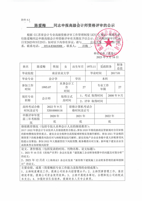 關(guān)于陳愛(ài)梅同志申報(bào)高級(jí)會(huì)計(jì)師資格評(píng)審的公示