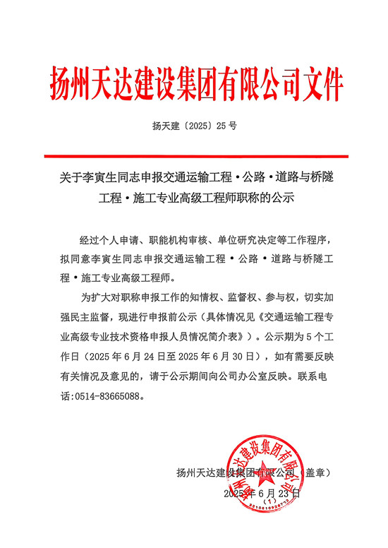 關(guān)于李寅生同志申報交通運輸工程?公路?道路與橋隧工程?施工專業(yè)高級工程師職稱的公示