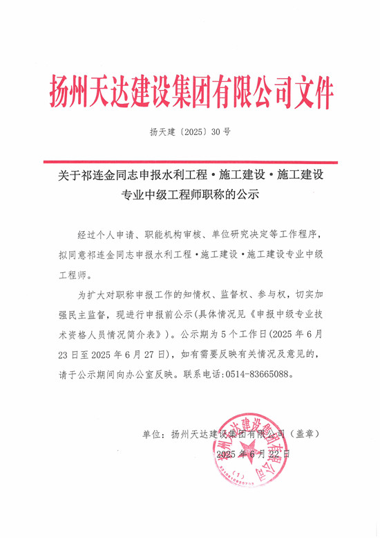 關(guān)于祁連金同志申報水利工程?施工建設(shè)?施工建設(shè)專業(yè)中級工程師職稱的公示