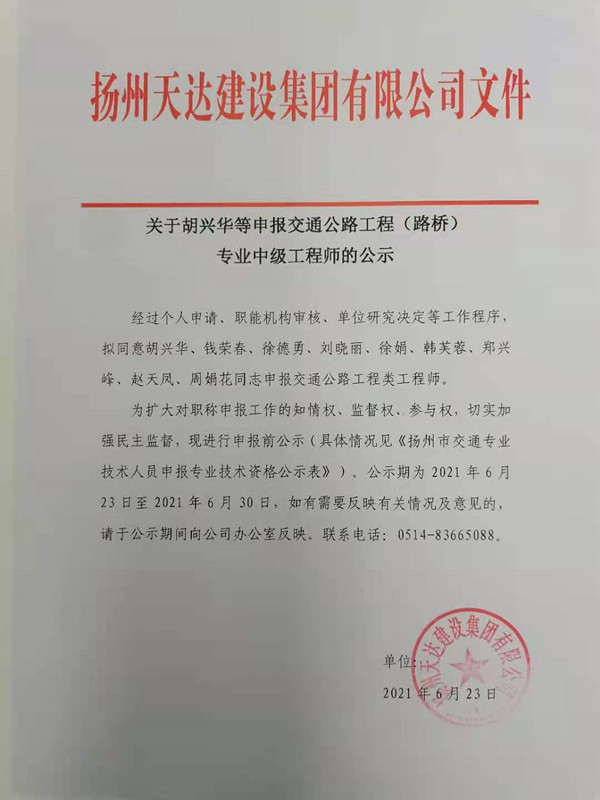 關(guān)于胡興華等申報(bào)交通公路工程(路橋)專(zhuān)業(yè)中級(jí)工程師的公示