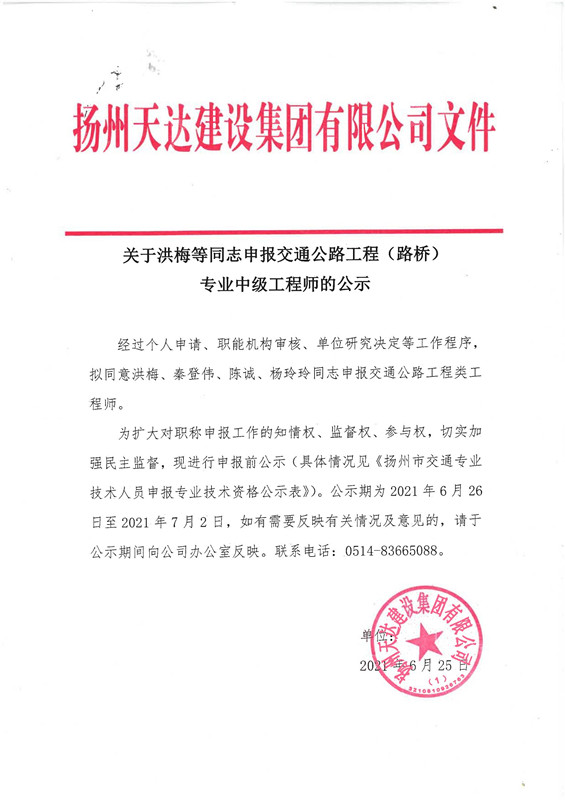 關(guān)于洪梅等同志申報(bào)交通公路工程(路橋)專(zhuān)業(yè)中級(jí)工程師的公示