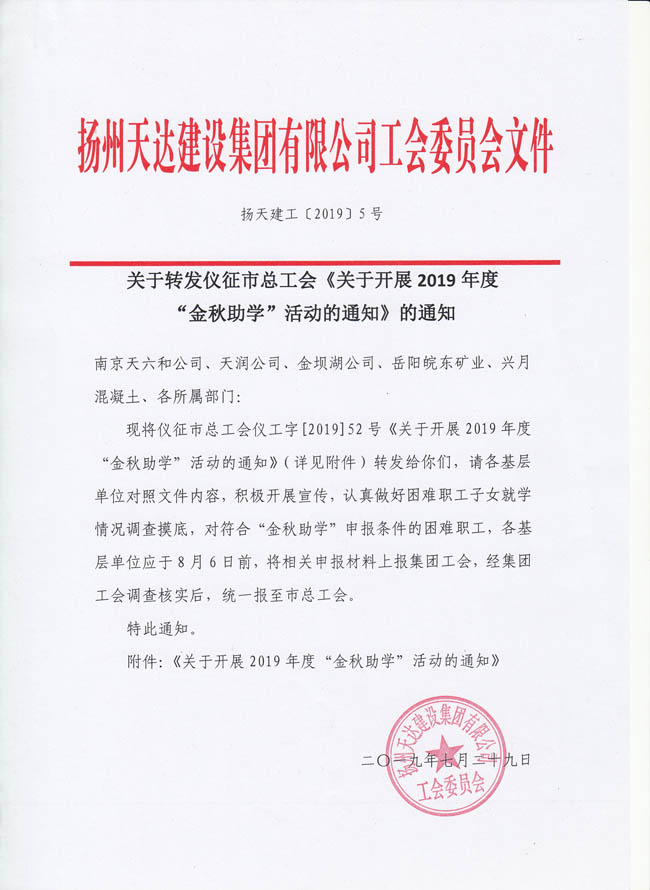關(guān)于轉(zhuǎn)發(fā)儀征市總工會《關(guān)于開展2019年度“金秋助學(xué)”活動的通知》的通知