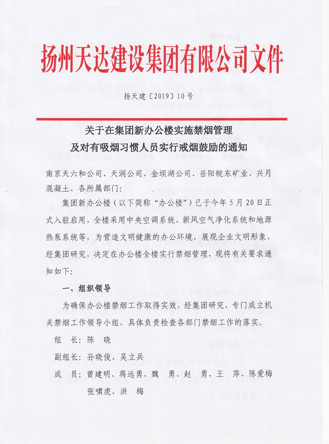 關(guān)于在集團(tuán)新辦公樓實(shí)施禁煙管理及對(duì)有吸煙習(xí)慣人員實(shí)行戒煙鼓勵(lì)的通知