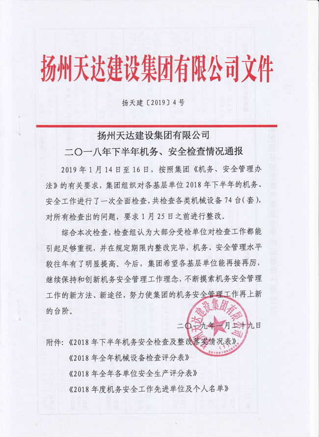 揚州天達(dá)建設(shè)集團有限公司2018年下半年機務(wù)、安全檢查情況通報