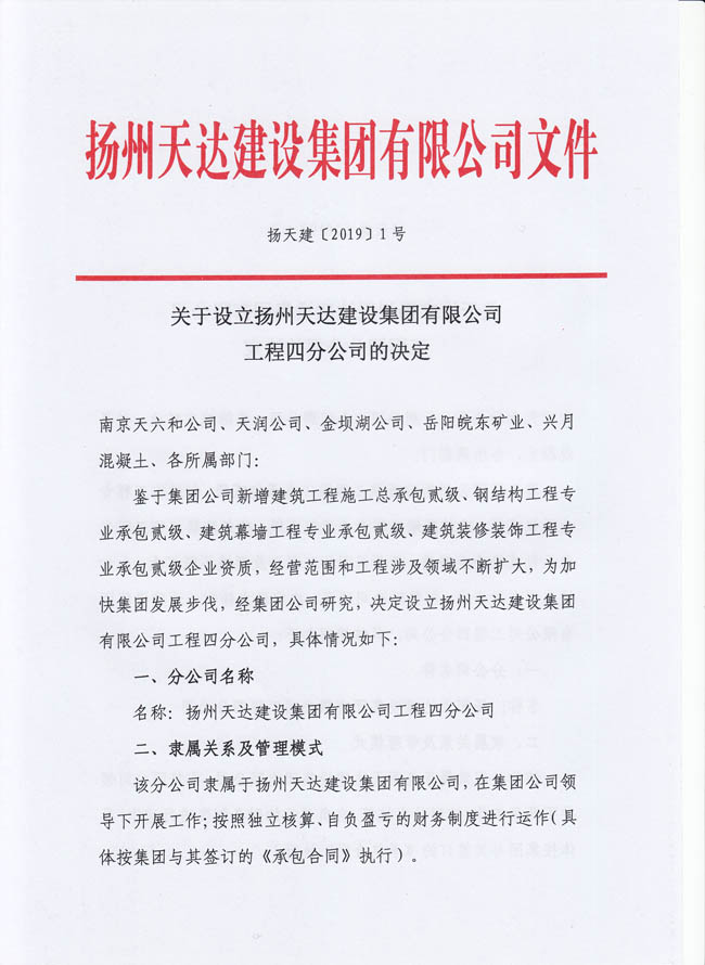關(guān)于設(shè)立揚(yáng)州天達(dá)建設(shè)集團(tuán)有限公司工程四分公司的決定