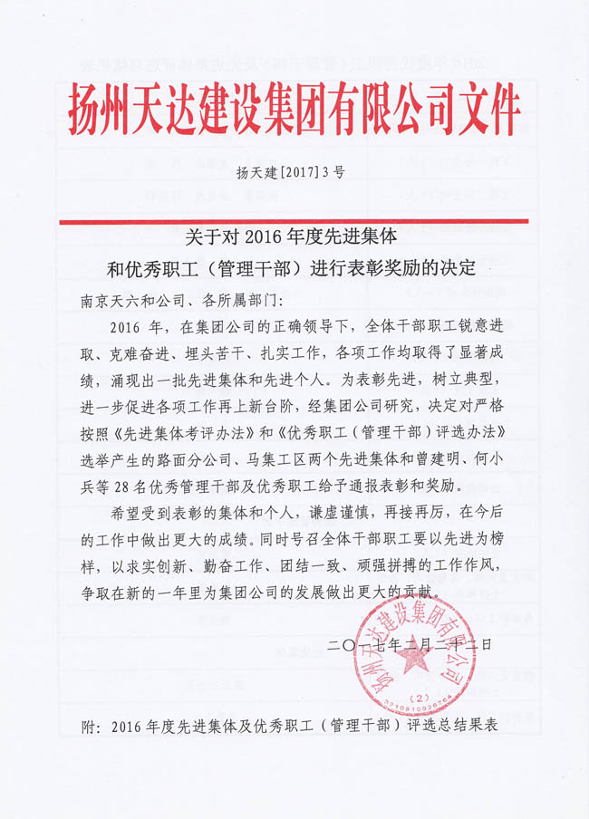 關于對2016年度先進集體和優(yōu)秀職工(管理干部)進行表彰獎勵的決定