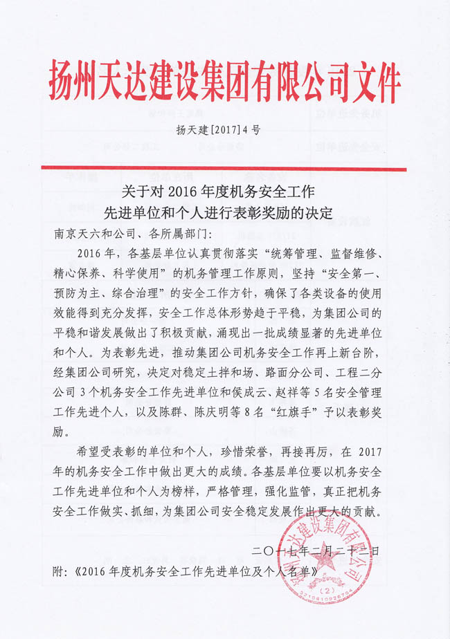 關于對2016年度機務安全工作先進單位和個人進行表彰獎勵的決定