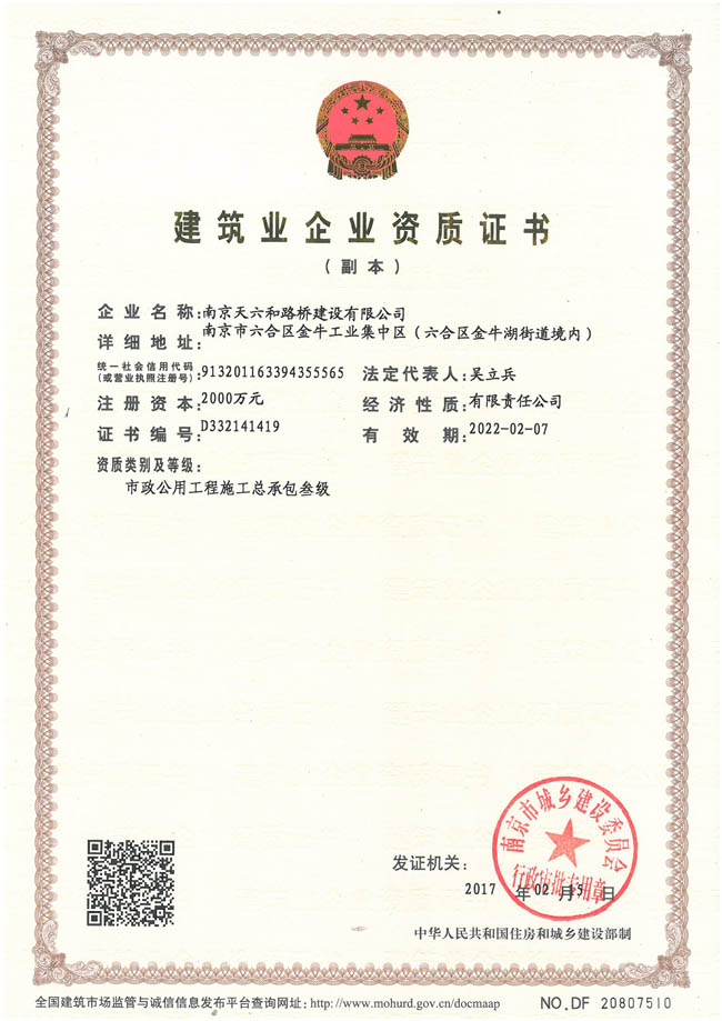 2月中旬,南京天六和路橋建設有限公司正式通過南京市城鄉(xiāng)建設委員會審批,順利取得了市政公用工程施工總承包三級企業(yè)資質(zhì)證書。