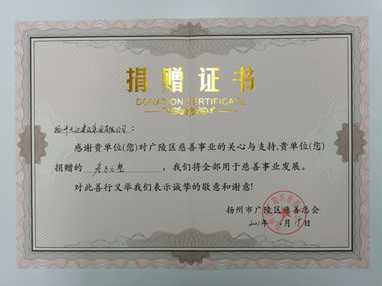 5月19日,為積極配合儀征市委市政府對(duì)慈善事業(yè)的要求,推動(dòng)慈善事業(yè)發(fā)展,根據(jù)儀征市委有關(guān)文件精神,集團(tuán)在全體職工中開展了“慈善一日捐”活動(dòng)?;顒?dòng)中,集團(tuán)工會(huì)專門下發(fā)了通知,積極營(yíng)造了慈善捐款活動(dòng)氛圍,62名中層副職以上人員踴躍參與捐款,共募得捐款12600元,連同集團(tuán)工會(huì)從扶貧濟(jì)困基金中安排的17400元,共30000元全部上交市慈善總會(huì)。另外,集團(tuán)旗下穩(wěn)定土拌和場(chǎng)同步向月塘鎮(zhèn)慈善分會(huì)捐款10000元。 此外,集團(tuán)參加了揚(yáng)州市廣陵區(qū)汶河街道開展的“慈善一日捐”活動(dòng),捐款30000元,榮獲了中共揚(yáng)州市廣陵區(qū)汶河街道工作委員會(huì)、汶河街道辦事處、汶河街道慈善分會(huì)聯(lián)合授予的2021年度“慈善之星”榮譽(yù)稱號(hào)。