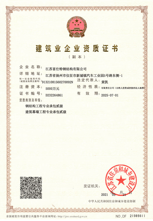 圖為江蘇富仕特鋼結(jié)構(gòu)公司資質(zhì)證書