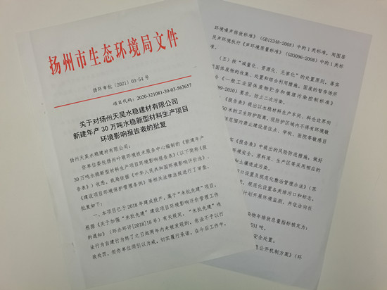 ▲6月份,位于月塘鎮(zhèn)趙橋村的儀征市興月混凝土有限公司的6.26畝土地的征地手續(xù)已經(jīng)全部通過,待公示期后即可取證。▲6月份,揚(yáng)州天昊水穩(wěn)建材有限公司“年產(chǎn)30萬噸水穩(wěn)新型材料生產(chǎn)項(xiàng)目”的環(huán)境影響報(bào)告表(揚(yáng)環(huán)審批[2021]03-54號(hào)文)已獲得揚(yáng)州市生態(tài)環(huán)境局批復(fù)。