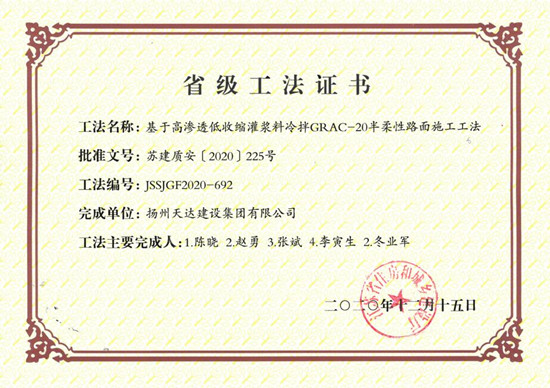 ▲10月7日上午,集團人力資源部參加儀征市重點企業(yè)專場招聘會,主要招聘法務(wù)行政、前場技術(shù)員、攤鋪機操作工。據(jù)了解,已收到若干應(yīng)聘者投遞簡歷。 ▲10月26日,集團在儀征市經(jīng)濟開發(fā)區(qū)閩泰大道西側(cè)注冊成立了揚州天達建設(shè)集團有限公司儀征經(jīng)開區(qū)分公司。 ▲10月份,集團收到江蘇省住房和城鄉(xiāng)建設(shè)廳頒發(fā)的《省級工法證書》,工法名稱:基于高滲透低收縮灌縫料冷拌GRAC-20半柔性路面施工工法。