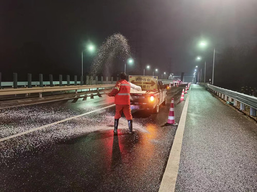 圖為養(yǎng)護(hù)人員連夜撒布融雪劑現(xiàn)場(chǎng)