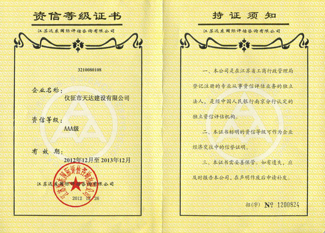 12月份公司獲得了中國人民銀行南京分行確認(rèn)的資信評估機(jī)構(gòu)江蘇遠(yuǎn)東國際評估咨詢有限公司評定的3A級資信等級。